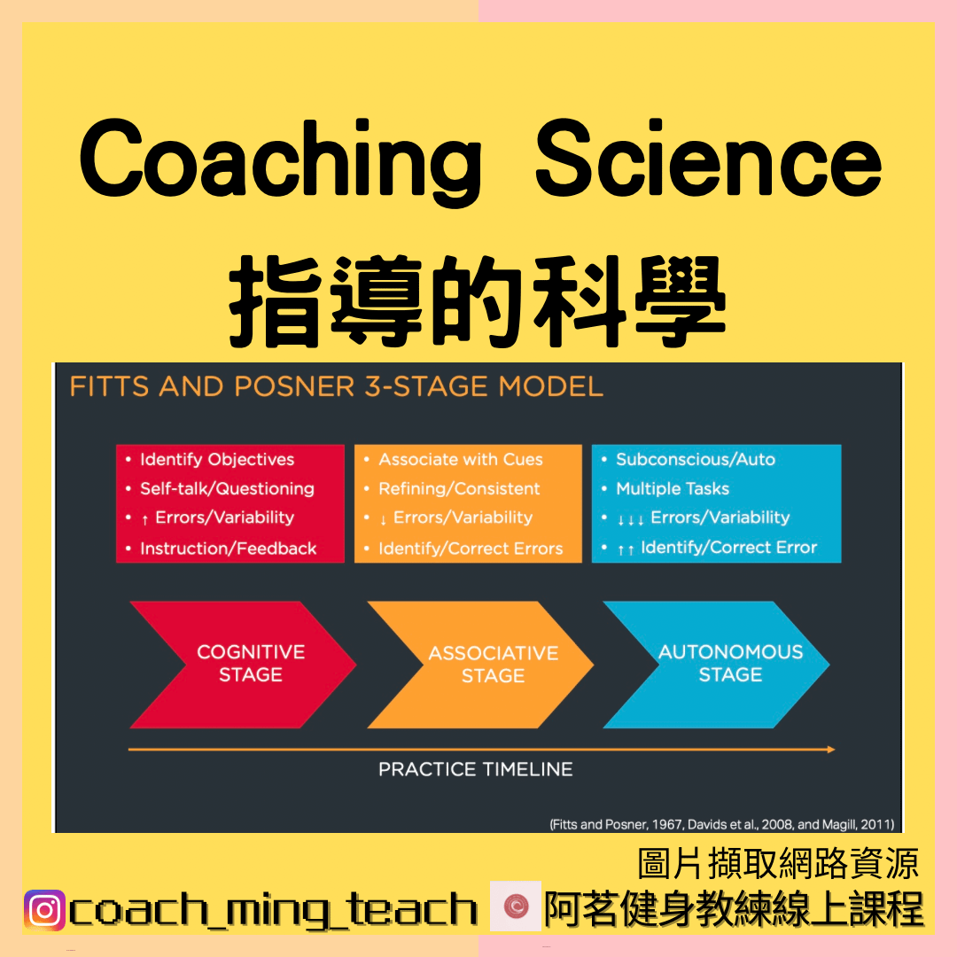 1. Cognitive Stage 認知階段: 確定目標,自我對話,懷疑,錯誤與動作變化度高,指導與回饋較多